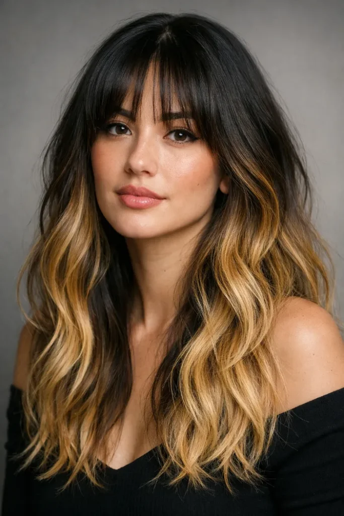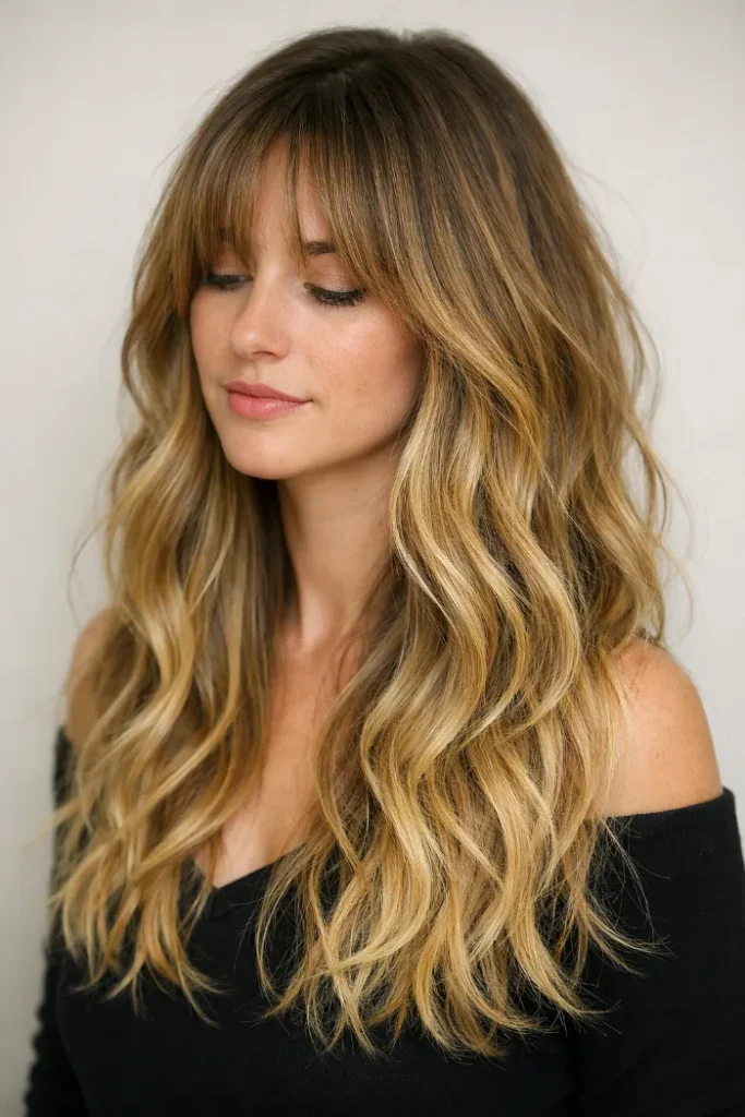Curtain bangs blend smoothly into the rest of the hair, helping the golden balayage feel cohesive from root to end.