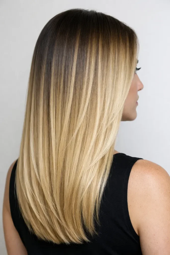 A darker root melts seamlessly into golden blonde lengths, giving this look depth and softness at the same time.