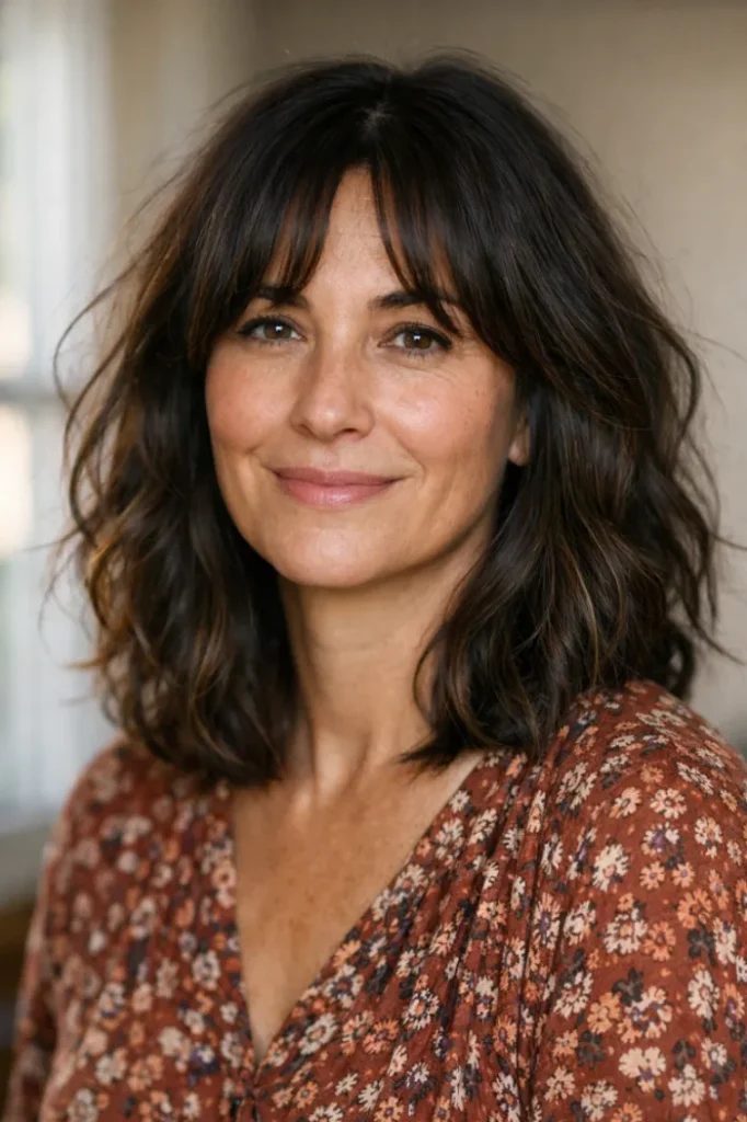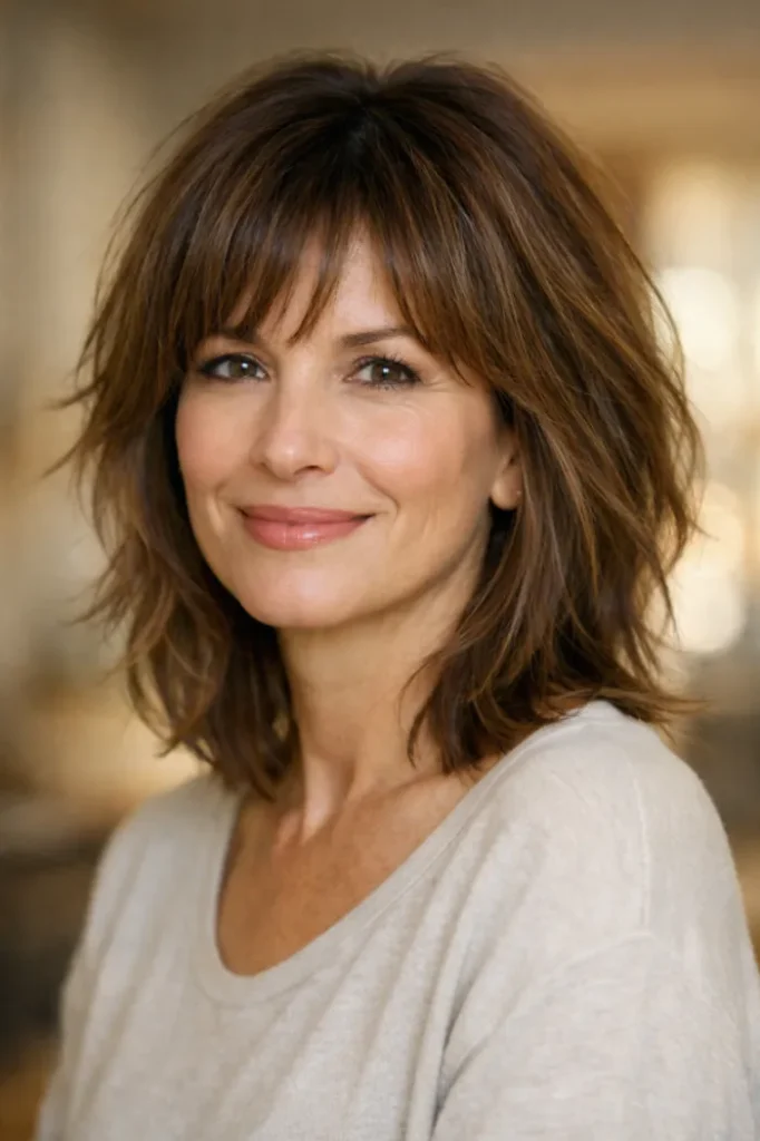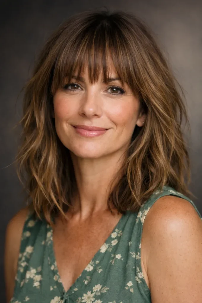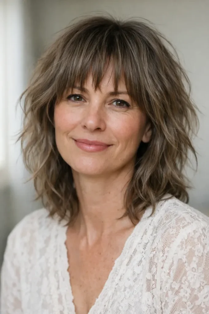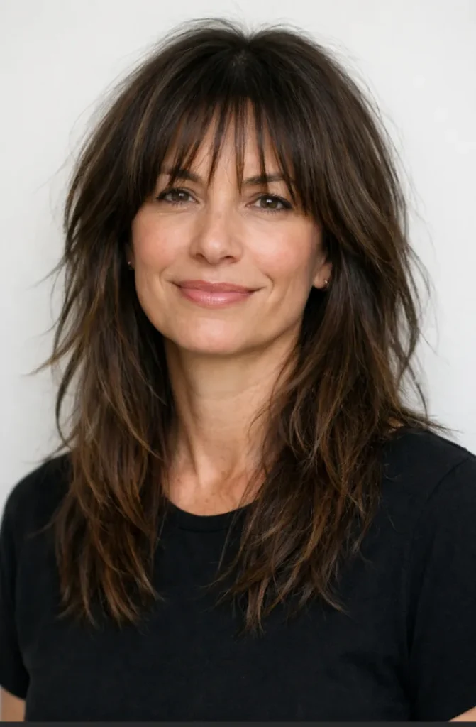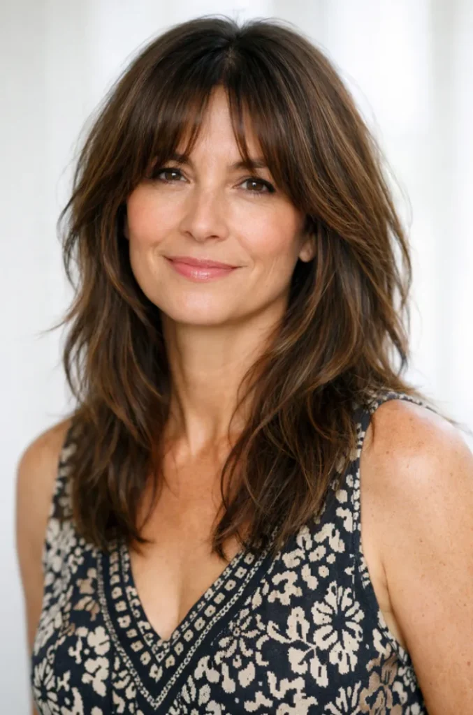The wispy bangs blend seamlessly into the layers, helping soften facial lines. It feels casual yet intentional, making it easy to style without much effort.