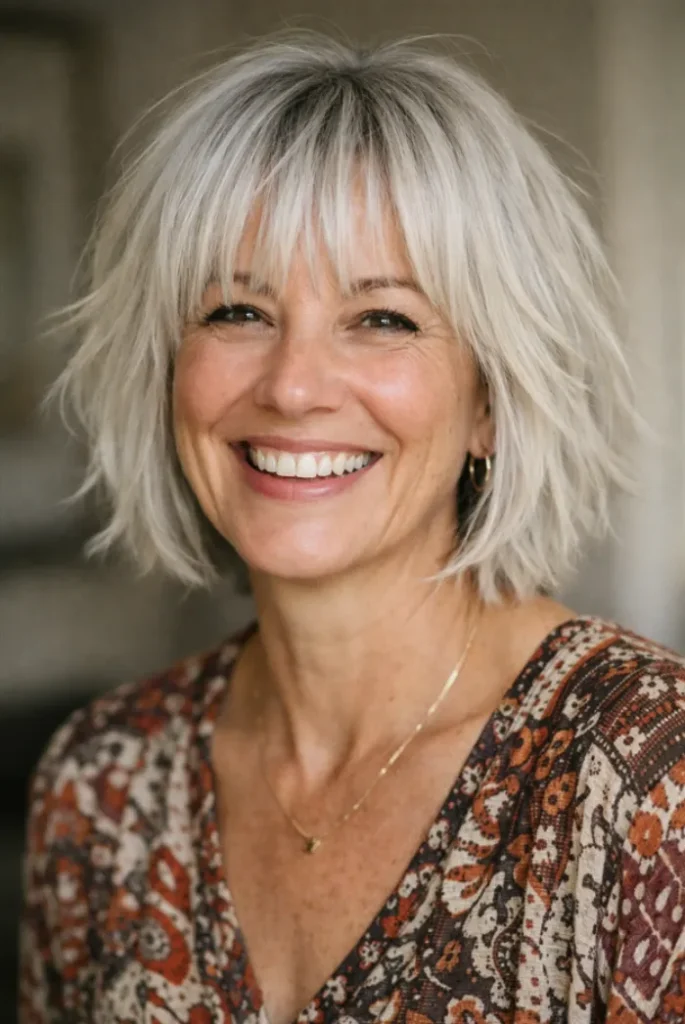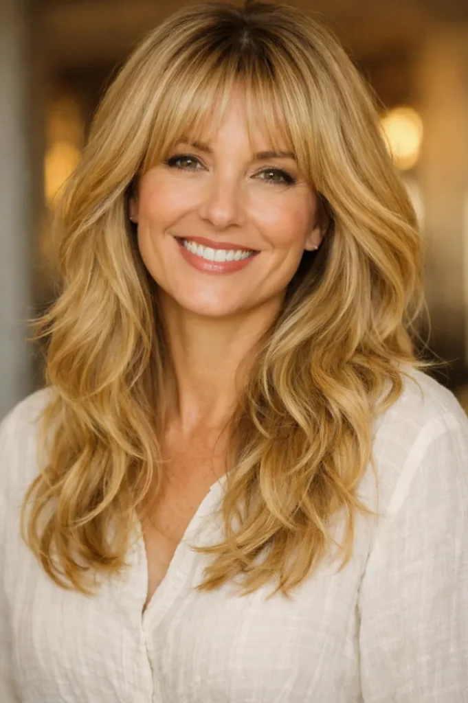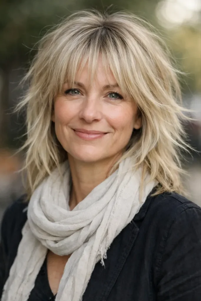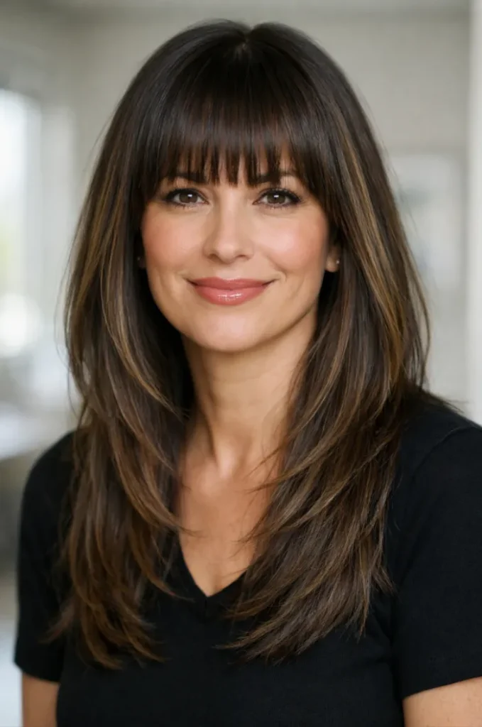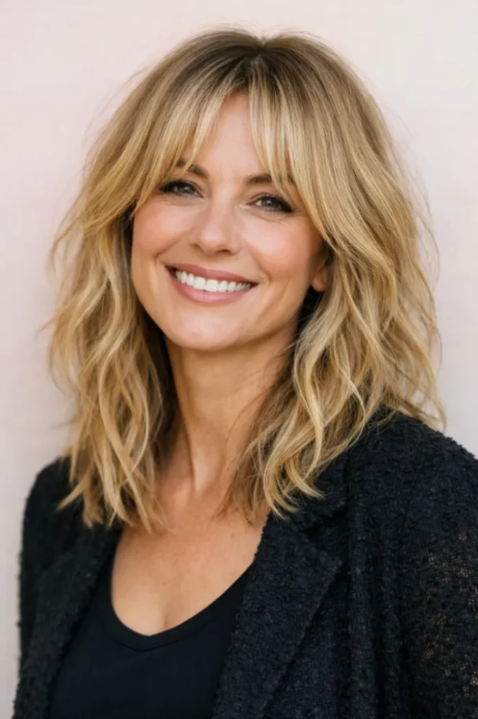 The wispy bangs blend seamlessly into the layers, helping soften facial lines. It feels casual yet intentional, making it easy to style without much effort.