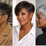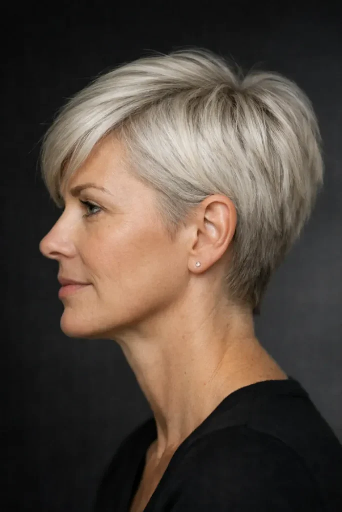 The short length highlights facial features, making the style feel fresh and modern. It is a bold yet refined choice for women embracing shorter hair with confidence.