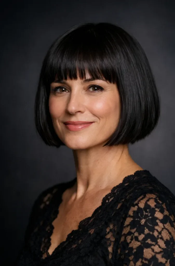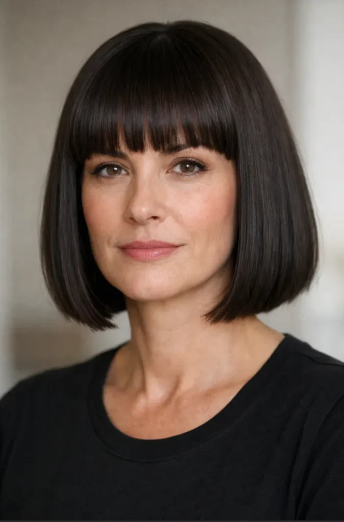 The sharp fringe draws attention to the eyes, while the smooth finish keeps the look polished. This works especially well for women who prefer structure and minimal daily styling.