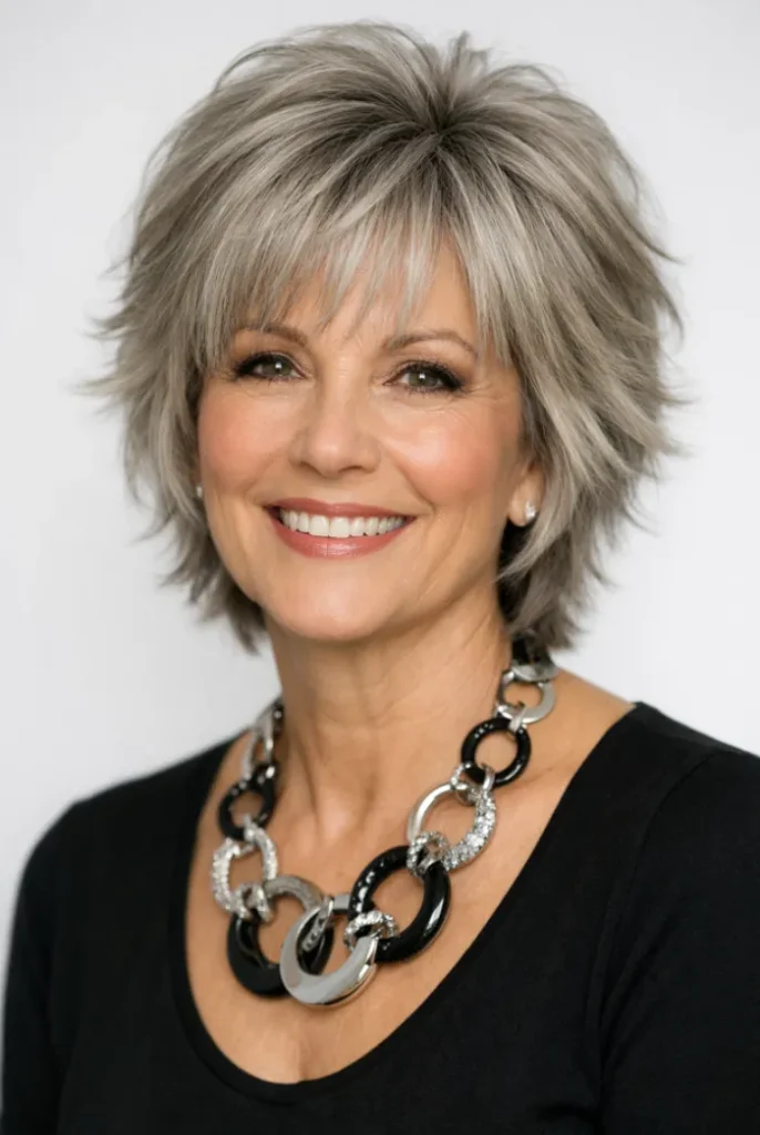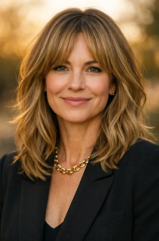 Feathered bangs soften the look and help frame the eyes. It suits women who want a youthful feel without chasing trends or committing to heavy styling.