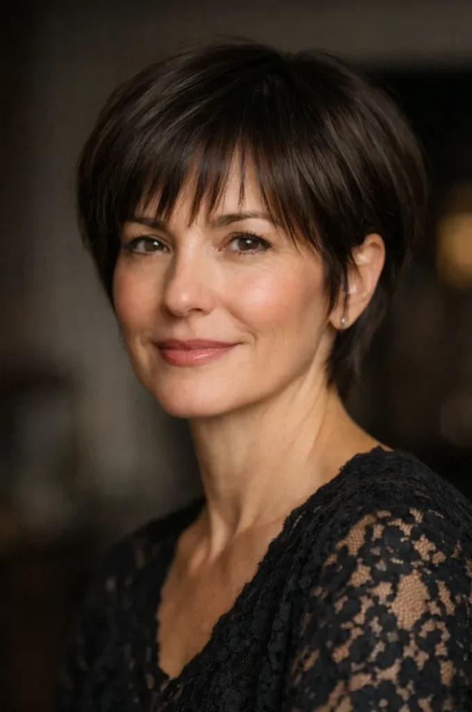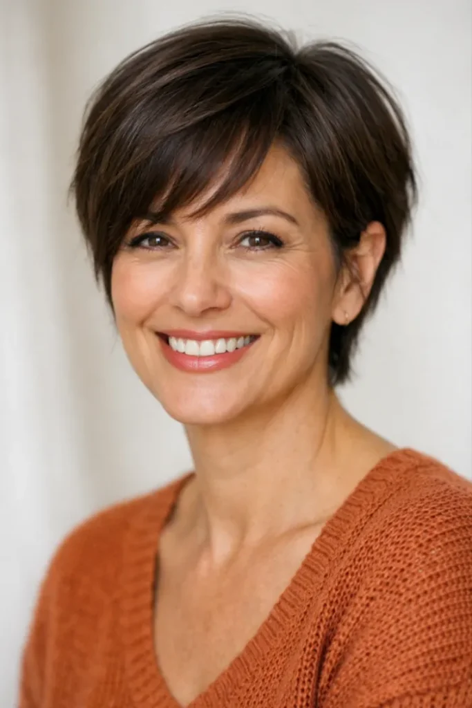 Wispy bangs add lightness and help soften the cut. It is a great option for women who want something shorter that still feels feminine and approachable.