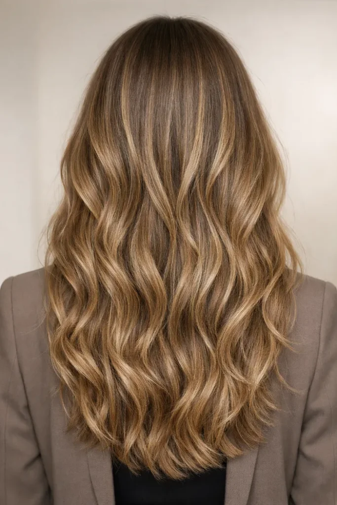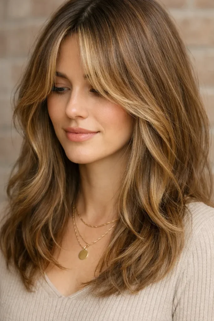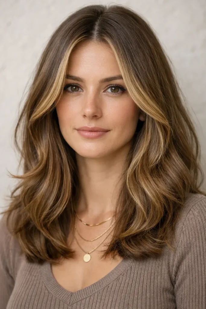 If you love a smoother finish, this light brown and blonde blend is such a safe bet. The color stays soft and even, with brightness focused on the ends. Ask for a beige-blonde melt with subtle face framing, plus long layers for movement.