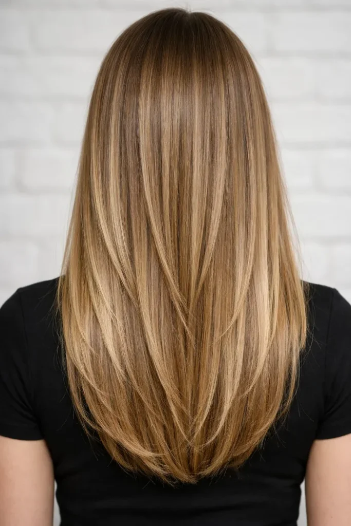 This long, layered cut is the easiest canvas for a soft bronde blend. The blonde is painted in wide, blended ribbons, so it reads natural from every angle. A neutral gloss keeps the tone creamy and stops it from going too warm.