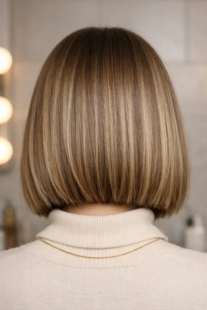 A blunt bob looks even thicker with honey-beige balayage. The ends stay bright, but the root remains light brown, so it feels soft and modern. Ask for fine, blended pieces rather than chunky highlights. A toner every 6–8 weeks keeps it fresh.
