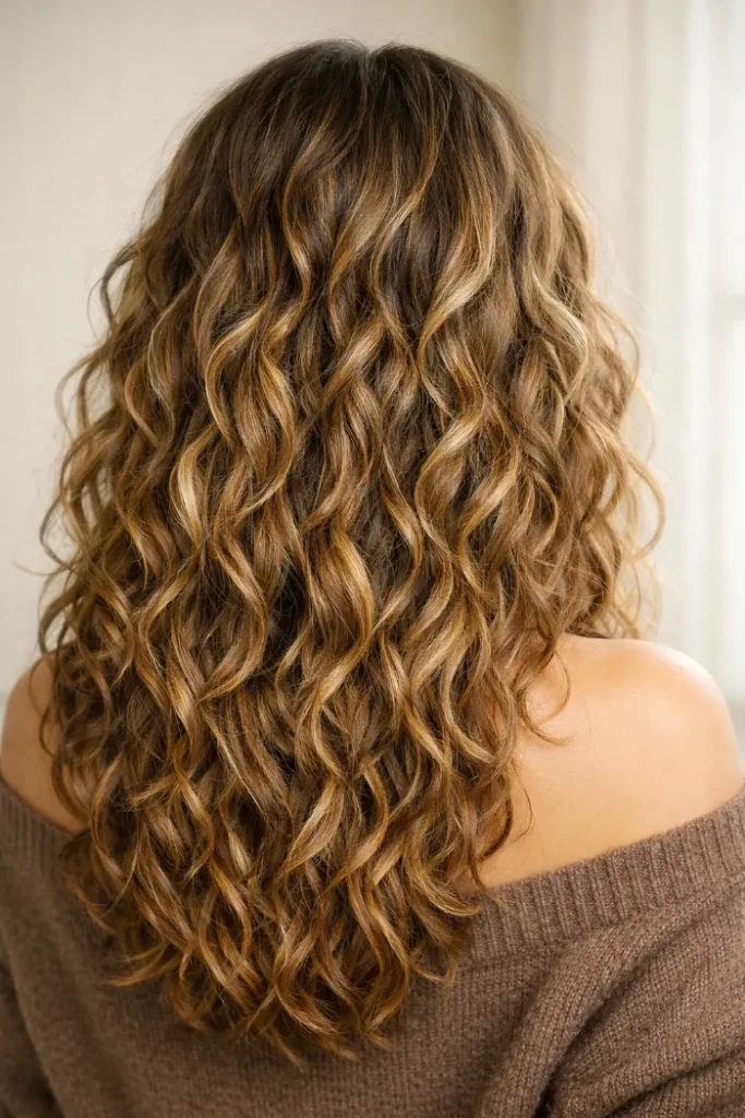 Balayage on curls is all about placement, and this one nails it. Warm blonde pieces sit on the outer curl pattern, so the texture looks defined and shiny. Tell your stylist to paint light on the mid-lengths and keep the root deeper.