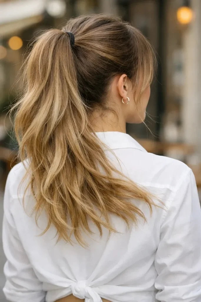 A high ponytail is a quick way to show off a balayage gradient. The crown stays deeper, then the ponytail swings into softer blonde ends. If you wear your hair up a lot, ask for extra brightness in the lengths so it still shows.