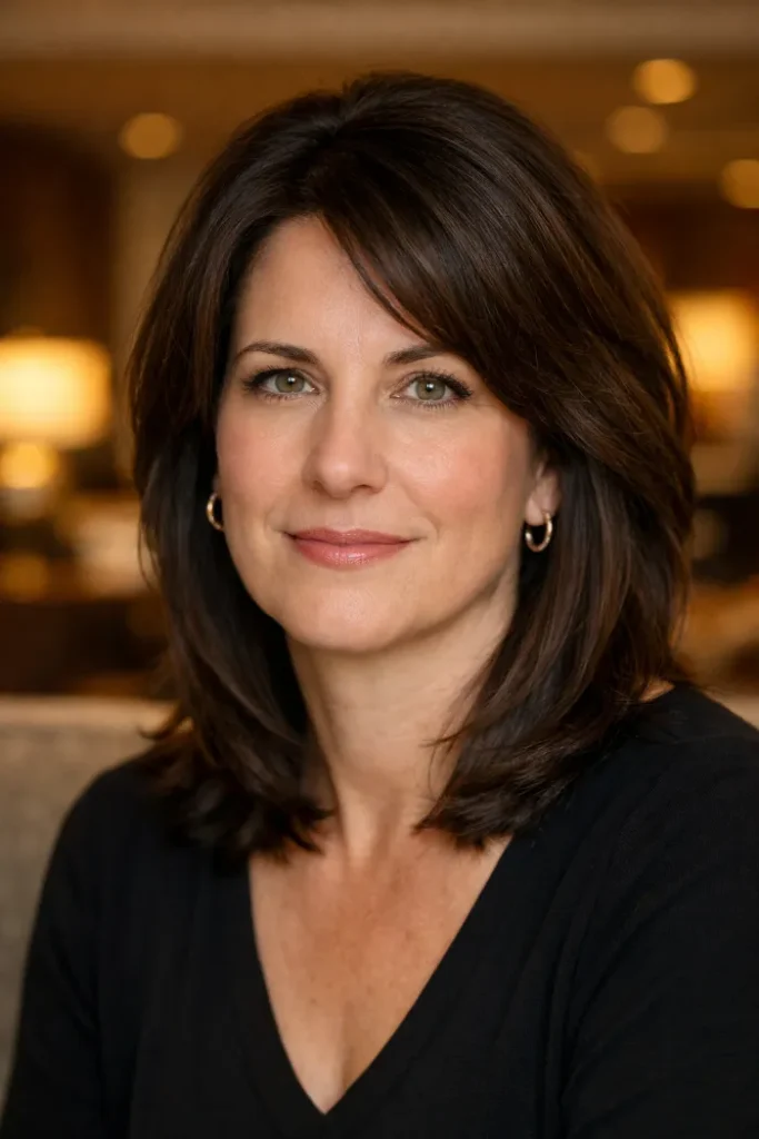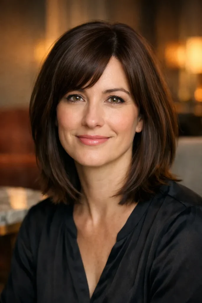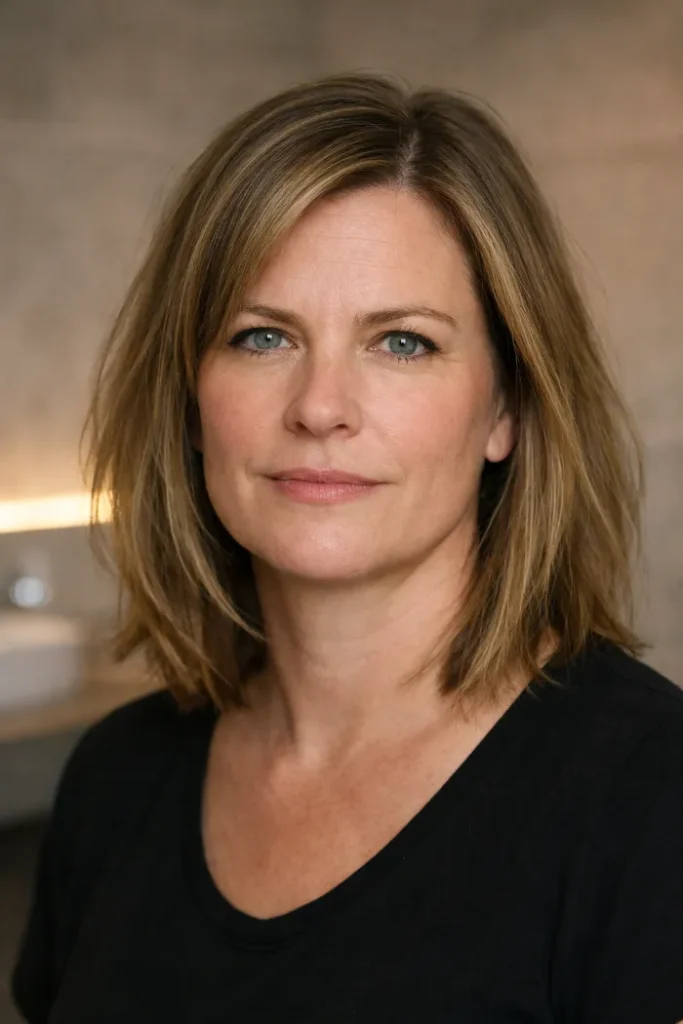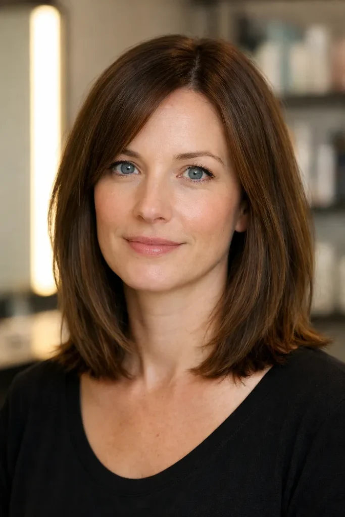 Ask for a low-maintenance lob with soft layering and a shape that does not need constant reshaping. Keep the length long enough to sit neatly on the shoulders, and remove just enough weight so the ends do not pile up.