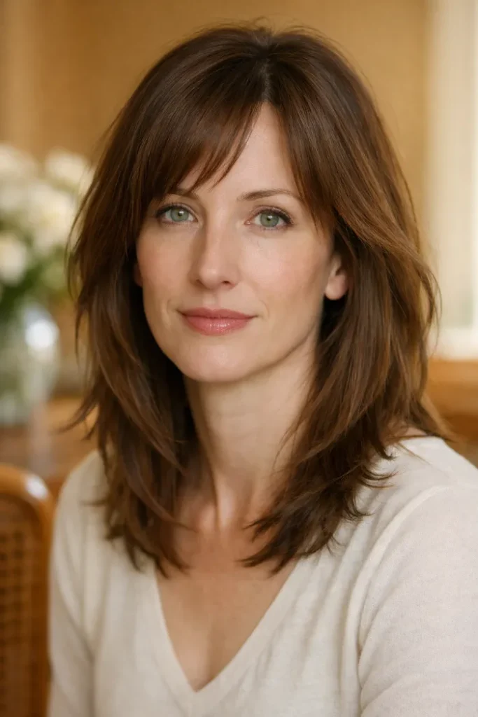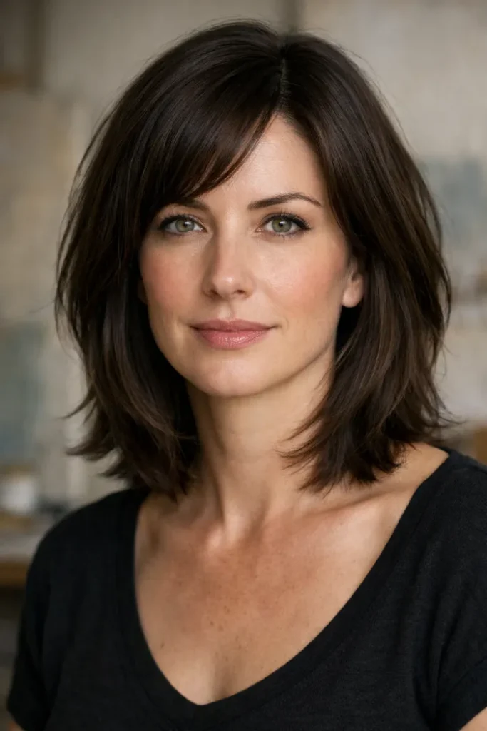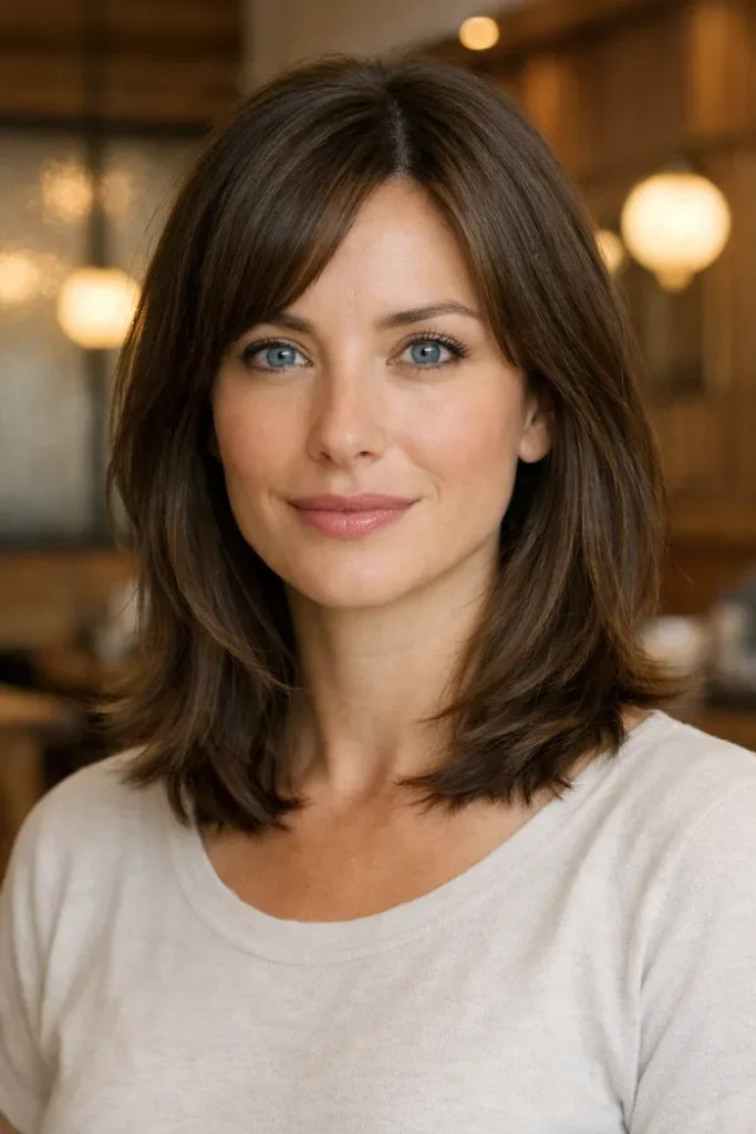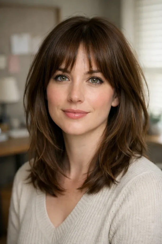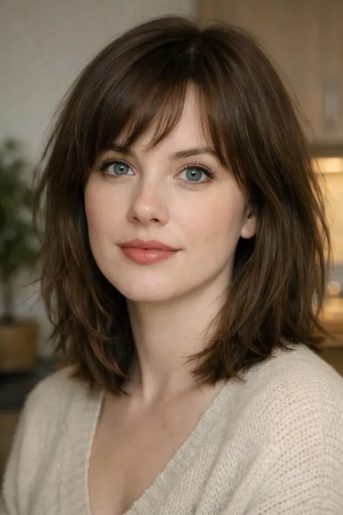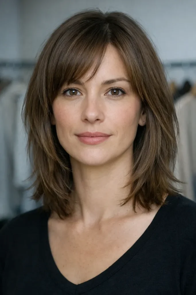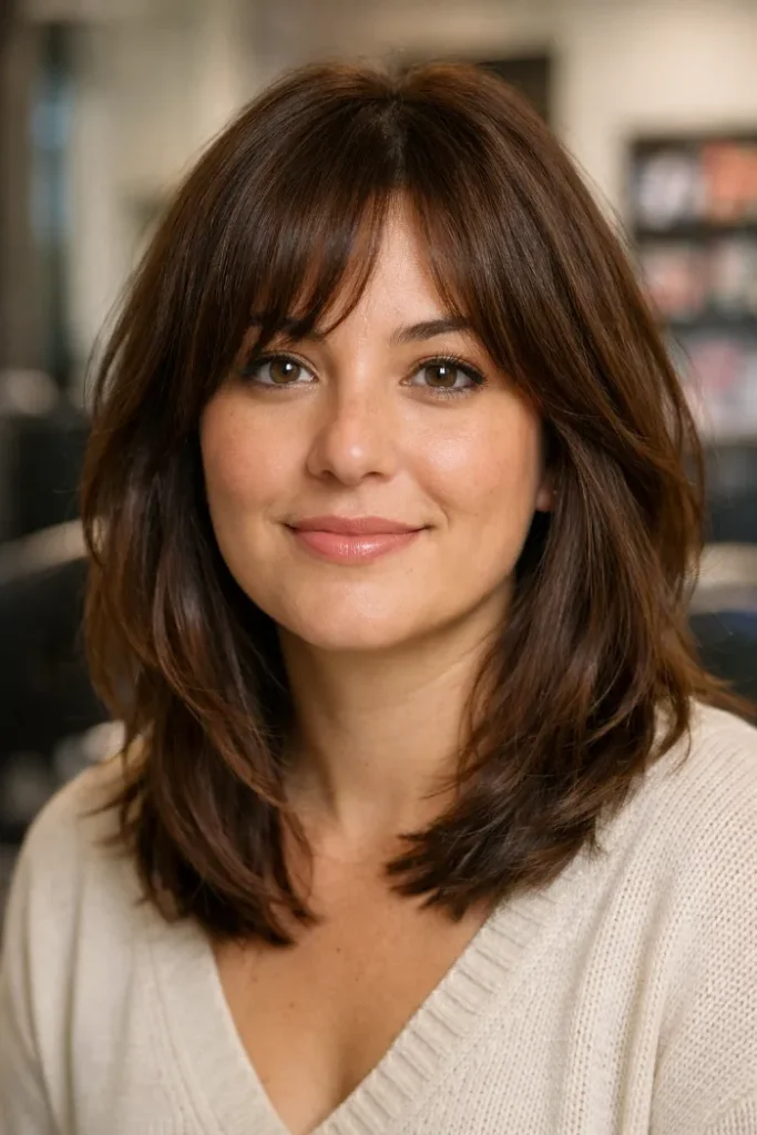 This medium cut uses a soft bottleneck fringe to open the face while the rest of the layers help thick hair sit with less bulk. The shape feels airy near the front, but it still keeps enough fullness to look balanced through the sides.