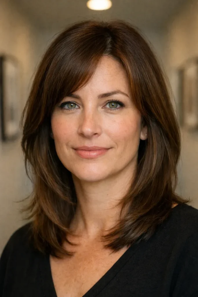 This layered medium cut softens thick hair with curtain bangs and gentle shaping around the cheeks. The length still feels full, but the front does not look heavy. It is a good option if you want movement without giving up too much thickness.