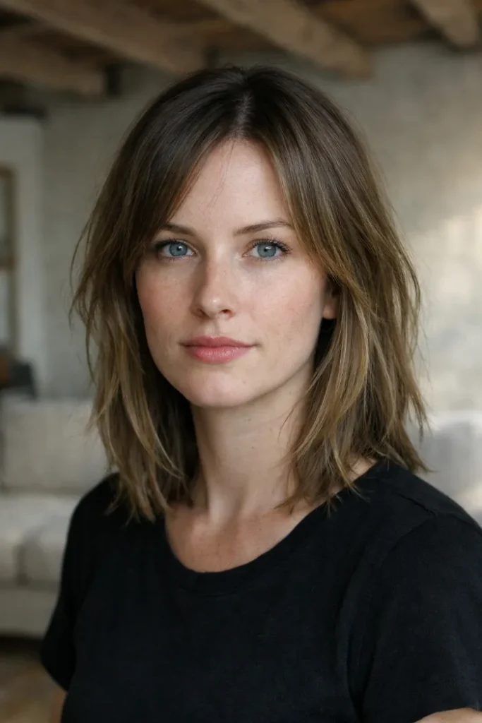 Ask for shoulder-length layers with texture through the interior, but leave the perimeter strong enough to hold the shape. This helps thick hair feel lighter while still looking full at the bottom, which keeps the cut from seeming too scattered.