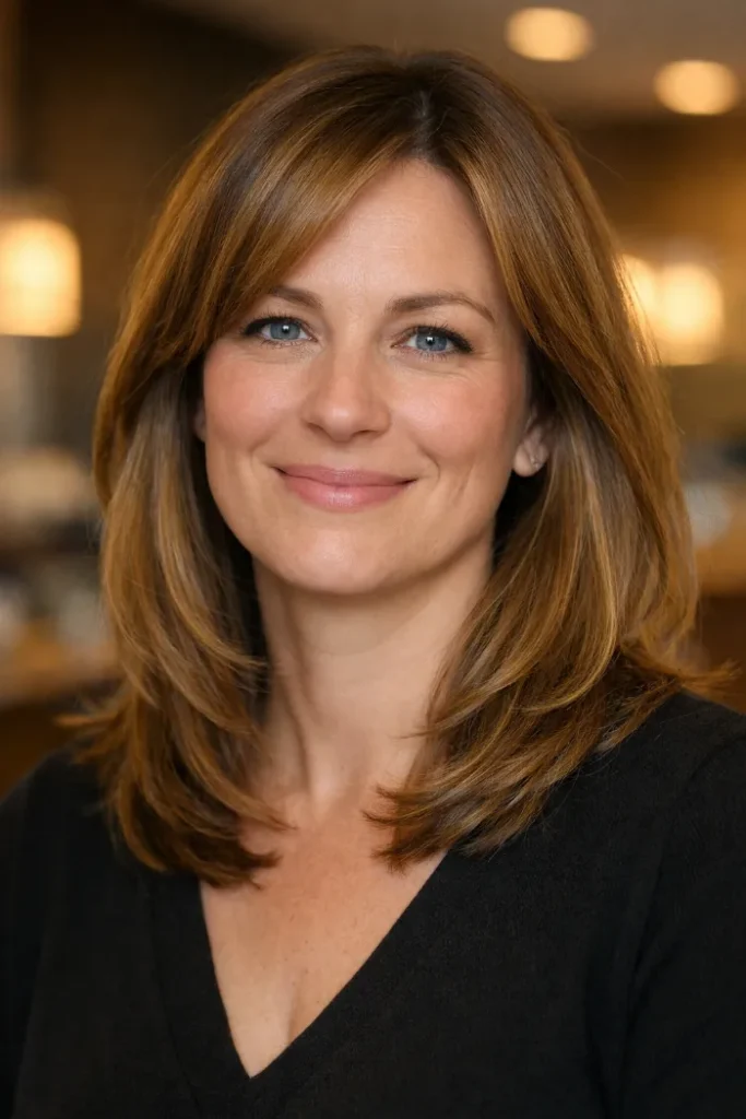 This layered cut has broken-up ends that help thick hair feel lighter and less solid. The shape still looks full through the middle, but the lower half moves better. It is a nice option if your hair tends to look heavy at the bottom.