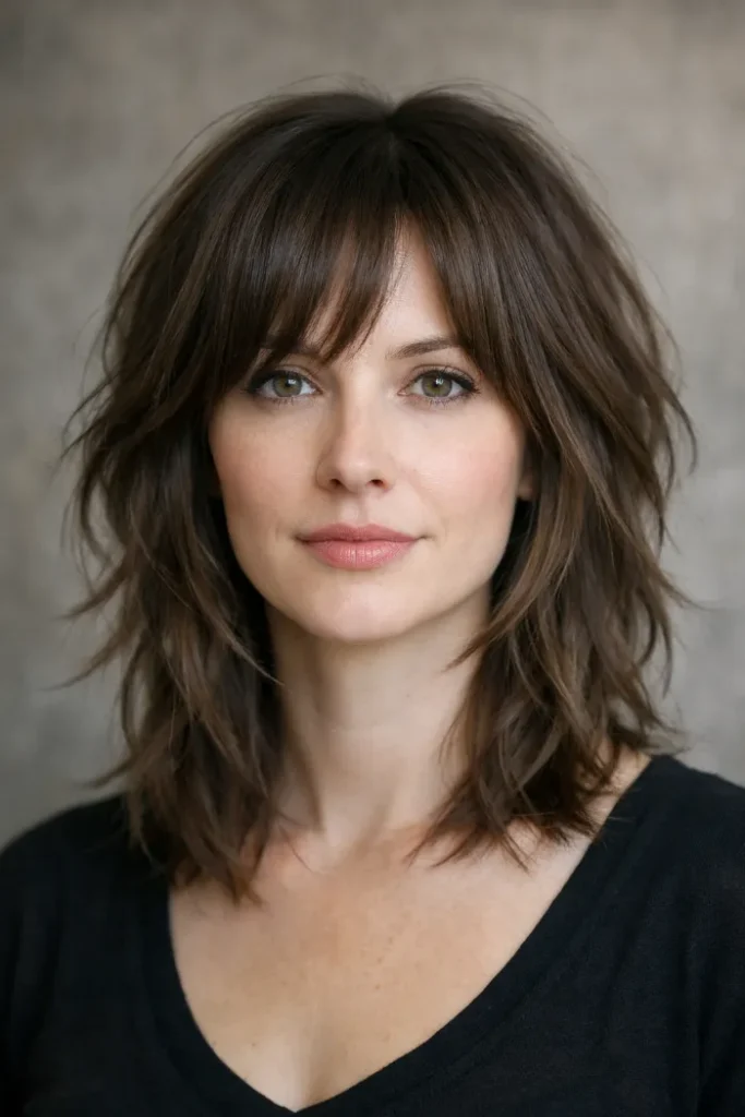 Ask for a mid-length shag with soft layers and a light fringe, not a harsh choppy shape. The goal is to remove weight and add movement, while still keeping enough length and fullness so thick hair does not look stringy.