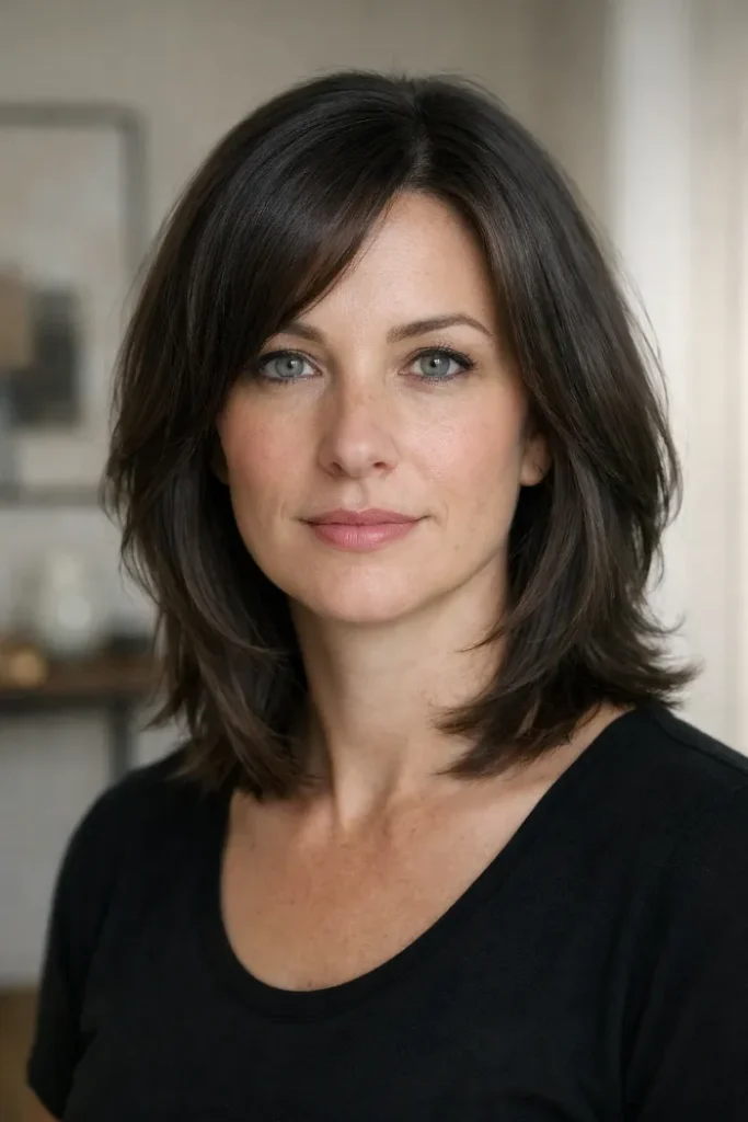 This medium cut uses soft layers around the face to break up heavy thickness without making the shape look thin. The ends stay full, but the front feels lighter and easier to wear. It is a nice choice if thick hair tends to sit wide.