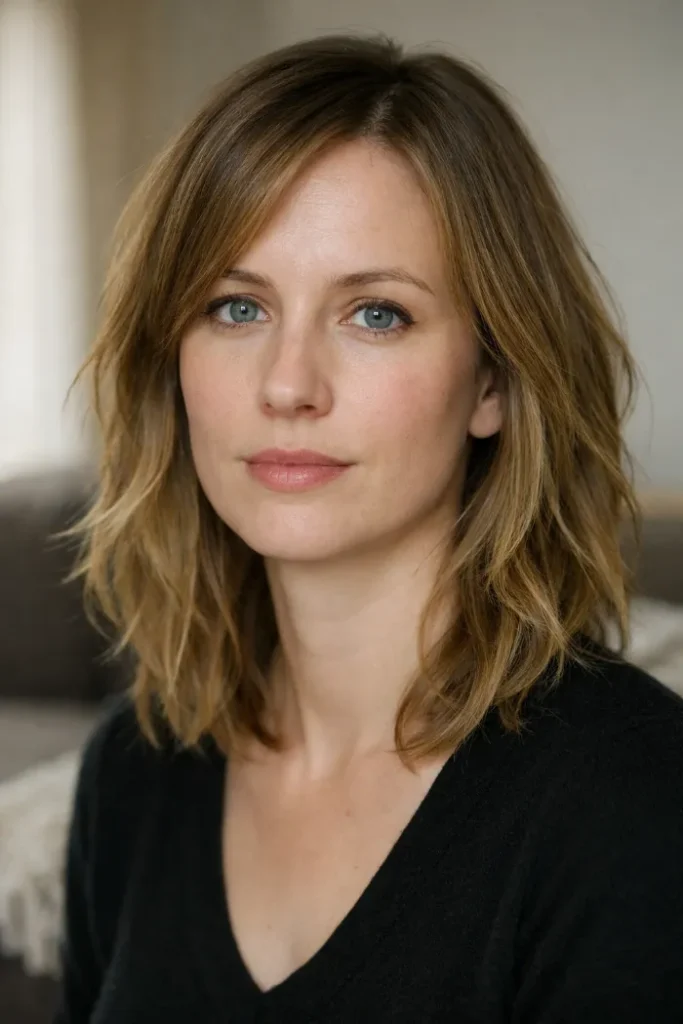 Ask for medium-length hair with soft face-framing layers and light shaping through the front. Keep enough weight through the bottom so the cut still feels full, but remove some bulk around the cheeks and jaw to help it sit softer.