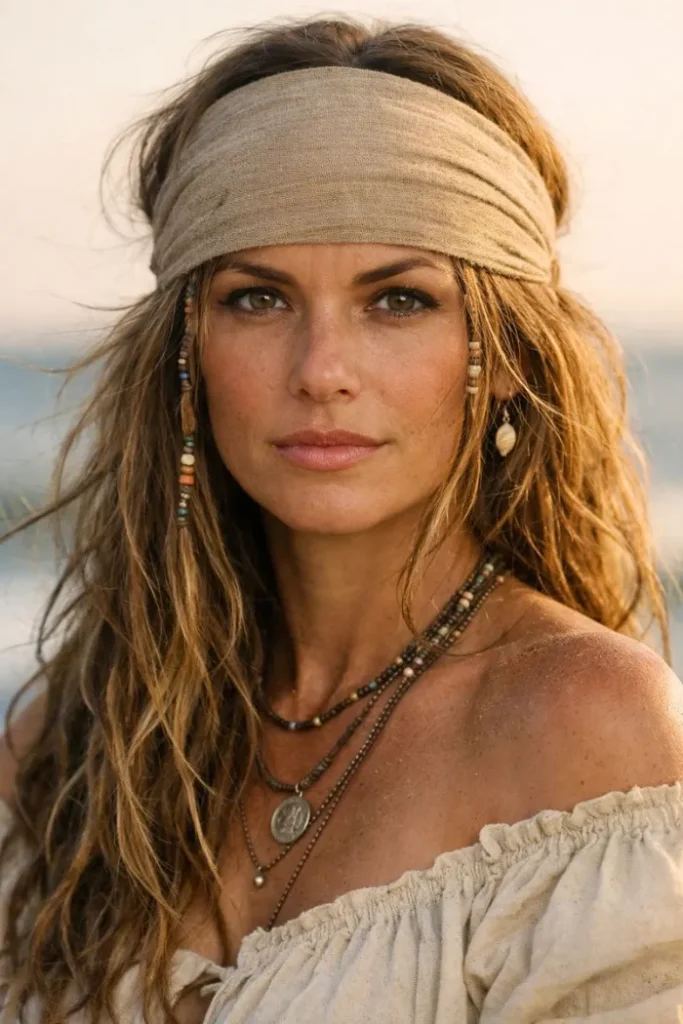 Keep the styling a little messy and stop at one “pirate” detail. Think scarf, ribbon, or one small braid with a cuff. Let the rest be normal hair you would actually wear, like loose waves or a low ponytail.