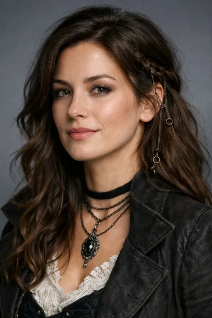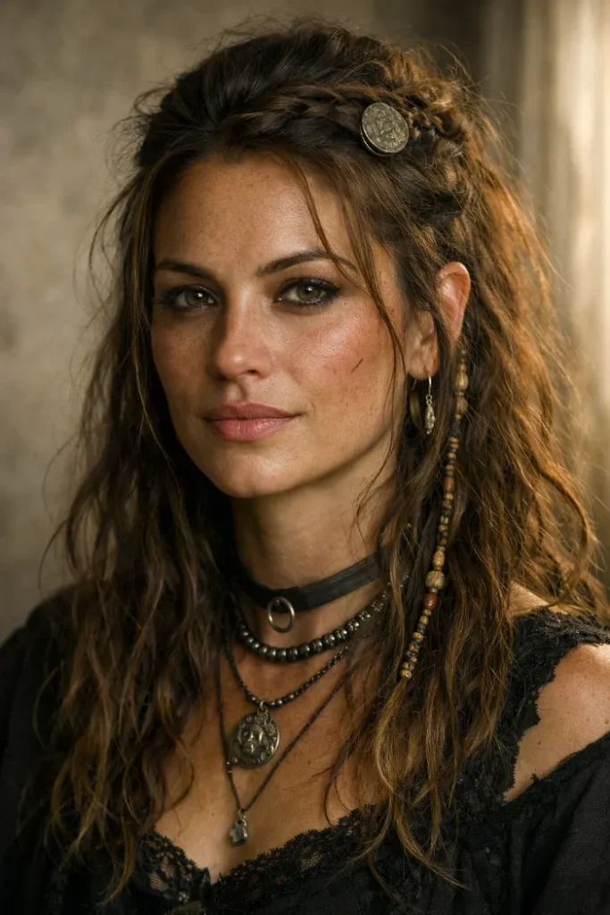 Loose waves with a tiny side braid is a simple way to add pirate detail. The braid sits near the temple and the chains hang down like jewelry, so it looks styled even if the rest of your hair is relaxed and natural.