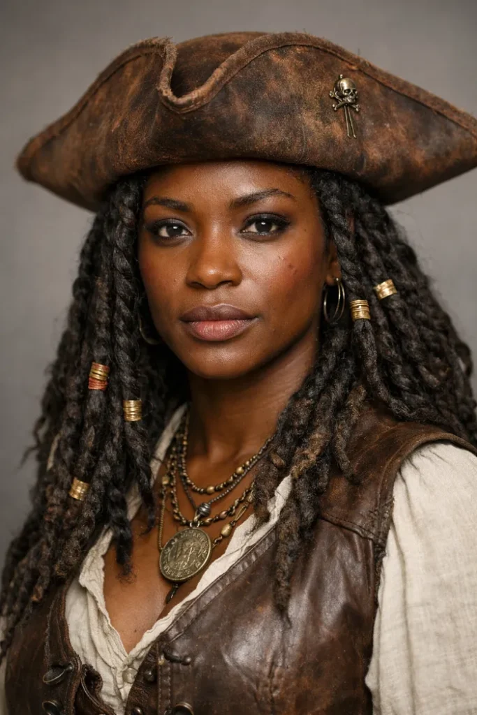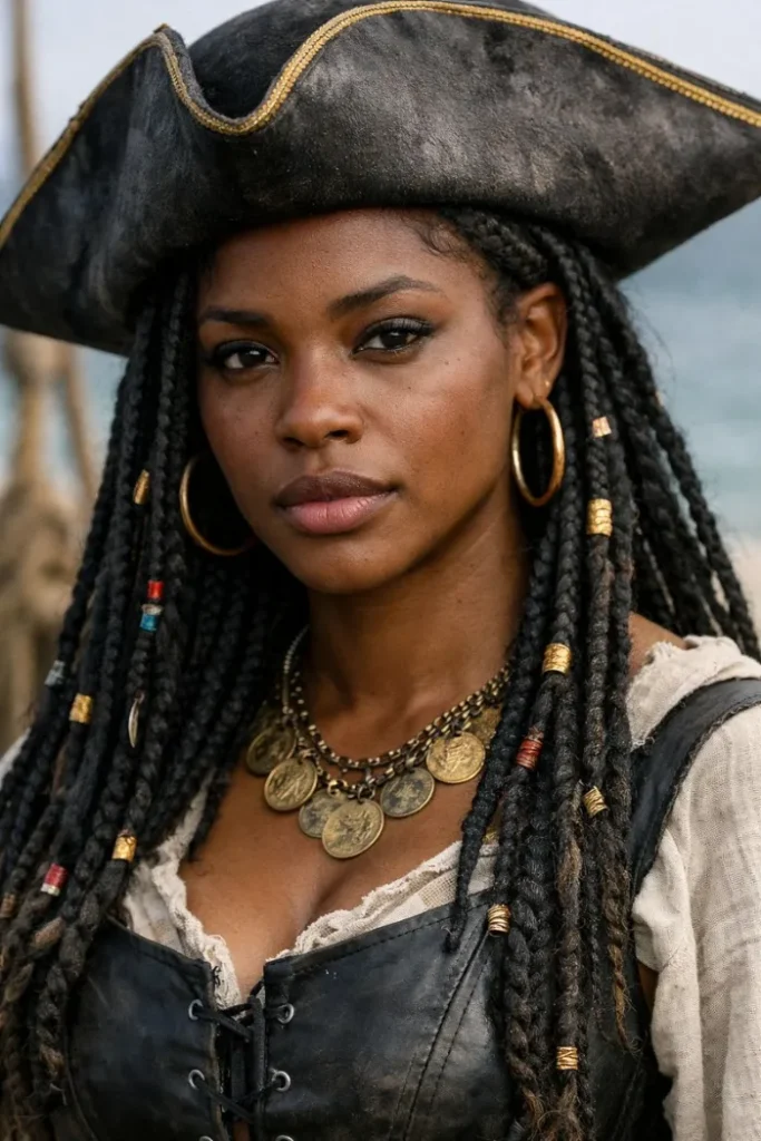 Long locs or braids with beads look incredible with a pirate hat because the texture already feels bold and lived in. Let the length sit forward over the shoulders so the accessories show. The mix of cuffs and beads adds just enough shine.