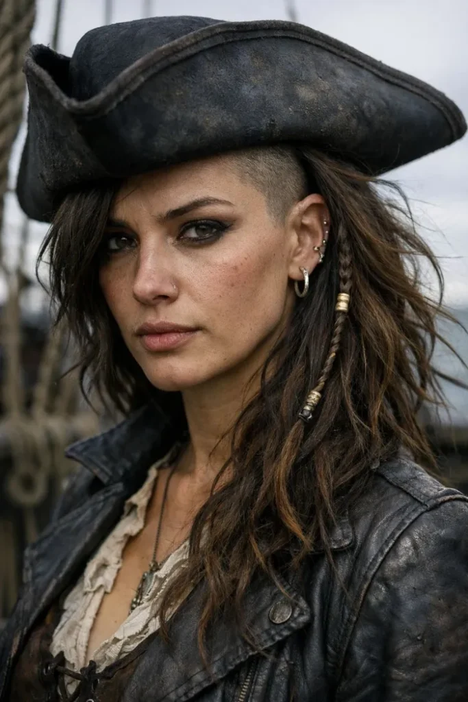 An undercut with tousled lengths brings a bold pirate edge. The hat frames the face while the longer side stays messy on purpose. Add one skinny braid or a few beads for detail. This style is nice if you like less bulk around the ears.
