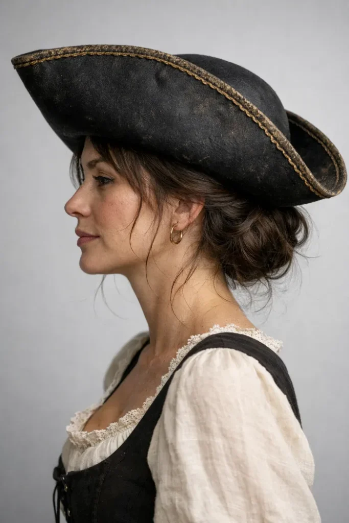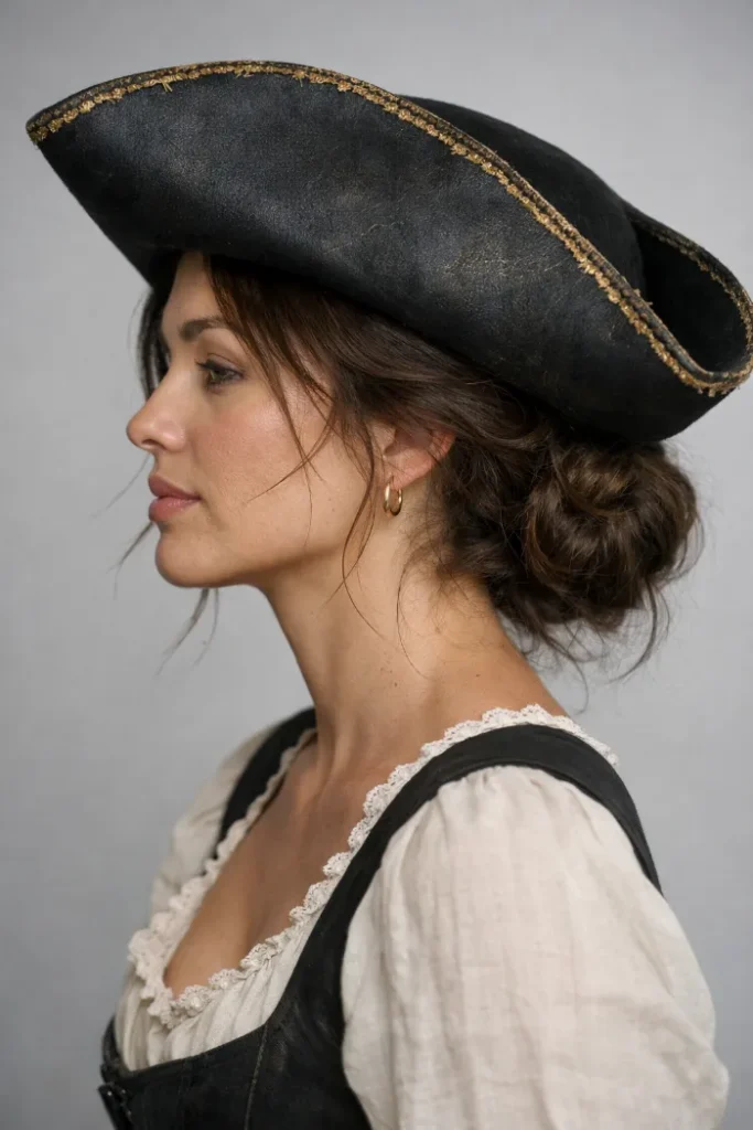 A low messy bun keeps everything tucked away and lets the tricorn hat be the star. Twist hair at the nape, pin loosely, and let a few wisps fall near the temples. If your hair is slippery, start with dry shampoo for hold.