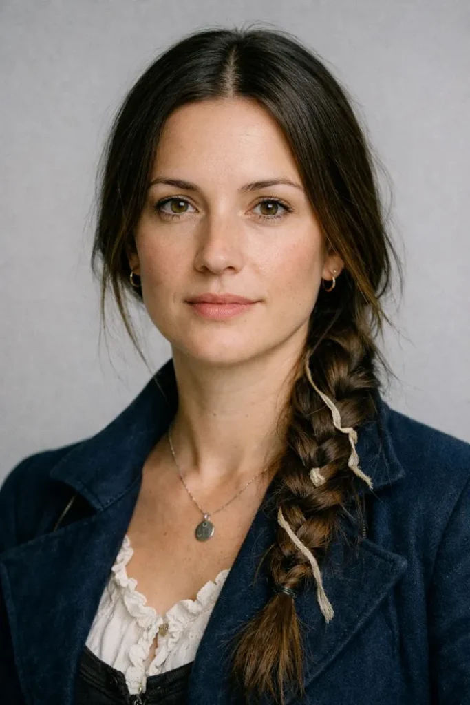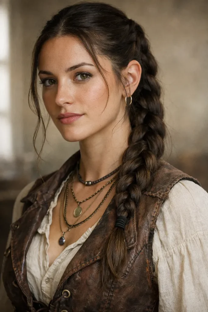 A long, loose braid is one of the easiest ways to get the pirate vibe fast. The center part keeps it clean, then the braid sits over one shoulder with a slightly imperfect pull. That little bit of looseness makes it believable.