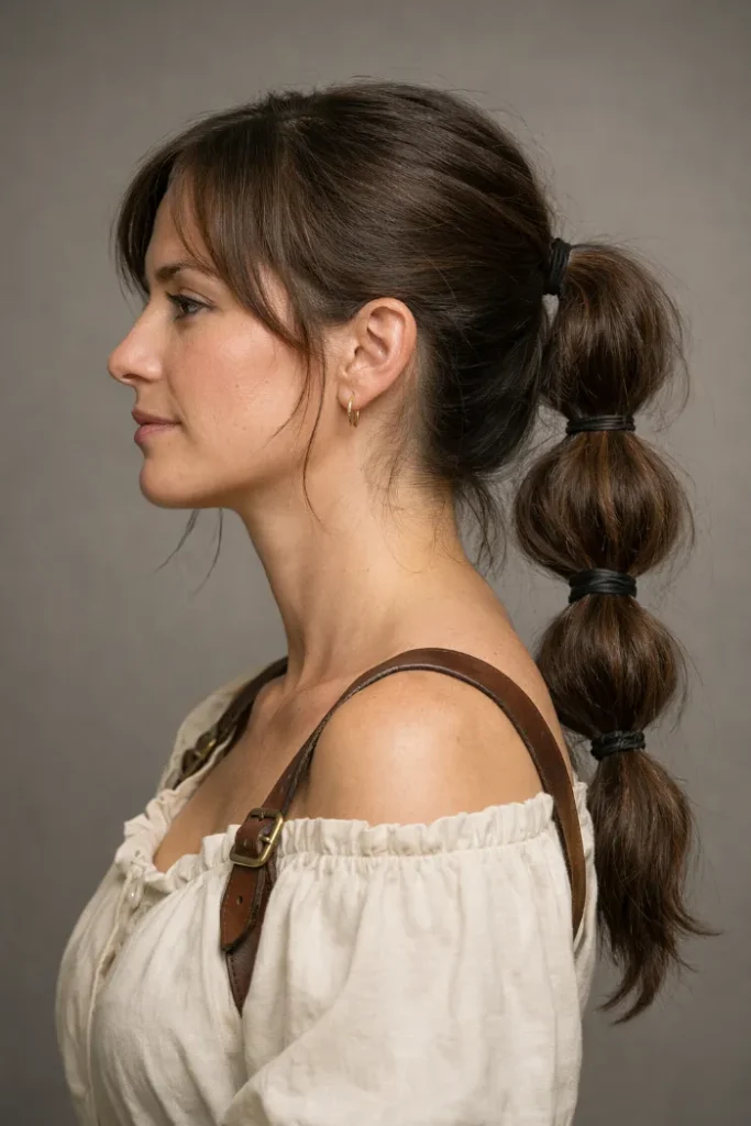 A bubble ponytail gives the same vibe as rope sections, but it’s quick to do. Tie a ponytail, then add elastics down the length and gently pull each section to puff it out. Great for longer hair and easy to refresh.