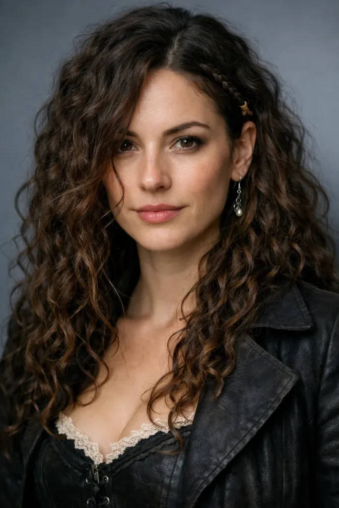 A deep side part makes curly hair look fuller right away, and the tiny braid detail adds a pirate touch without going overboard. Keep the braid close to the temple, then let the curls do their thing. A curl cream helps reduce frizz and keeps shape.