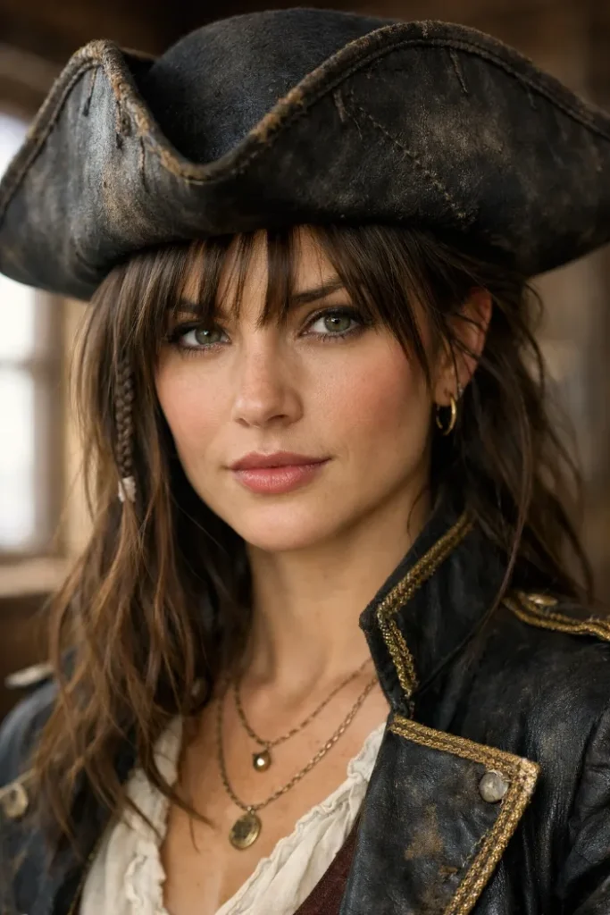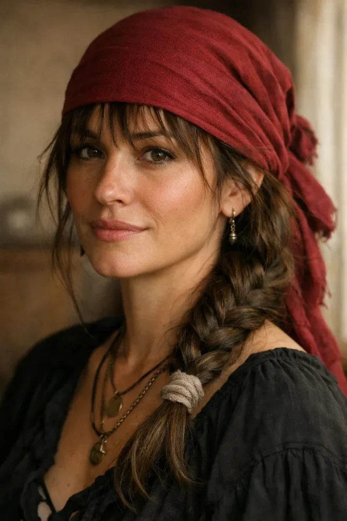 Wispy bangs peeking out instantly soften a pirate look. The fringe breaks up the forehead and makes the style feel less harsh, even with bold accessories. Keep the bangs airy and slightly uneven. That little imperfection is what sells it.