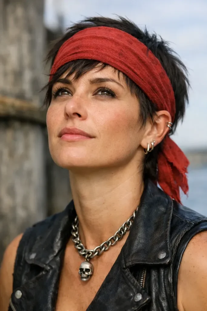 A short cut plus a red bandana feels bold and simple in the best way. Tie it just behind the hairline and let the top stay piecey. This is perfect if you want a pirate vibe that still looks modern. A light wax helps define the ends.