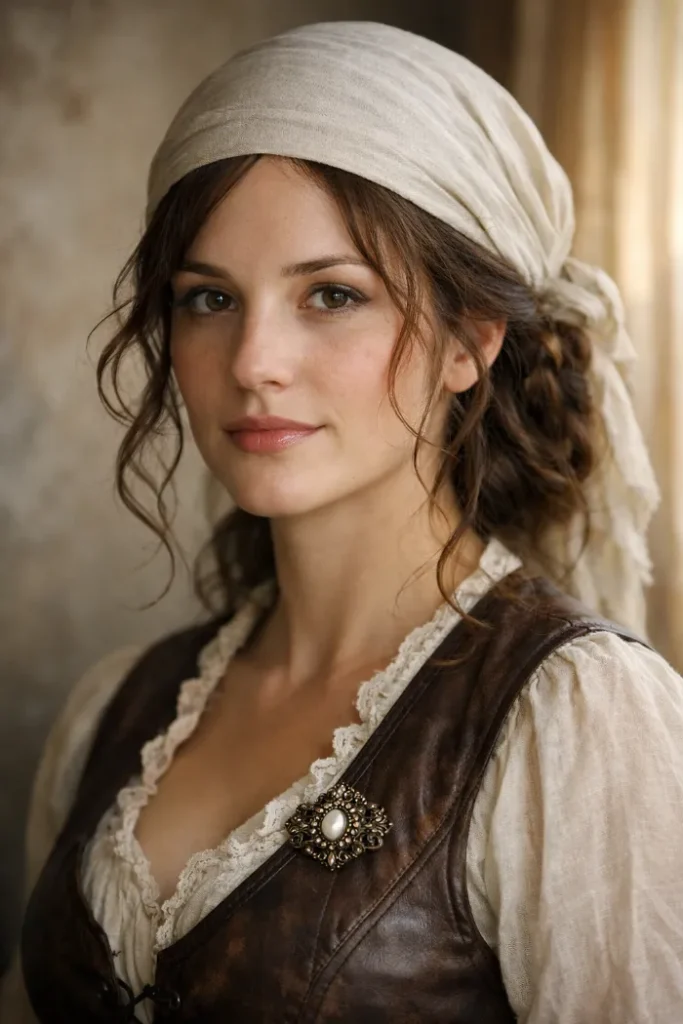This soft headscarf look gives true pirate energy without trying too hard. The fabric sits low on the hairline and the loose curls keep it romantic. Pull a few tendrils out around the cheeks so it does not look costume-y.