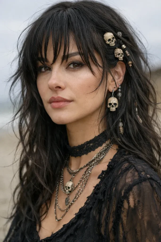 These wispy waves with choppy bangs feel like a modern pirate queen. The texture is messy on purpose, with pieces breaking up the outline so it looks lived in. Add a few small charms or beads on one side for attitude.