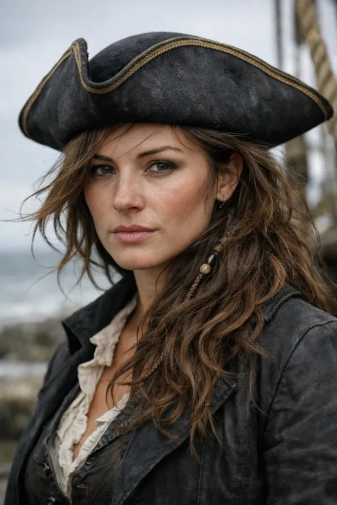 Windswept waves under a tricorn hat look dramatic in the best way. The hair stays loose and touchable, with face framing pieces that move around the cheekbones. It reads pirate, but still pretty, especially with soft volume at the crown.