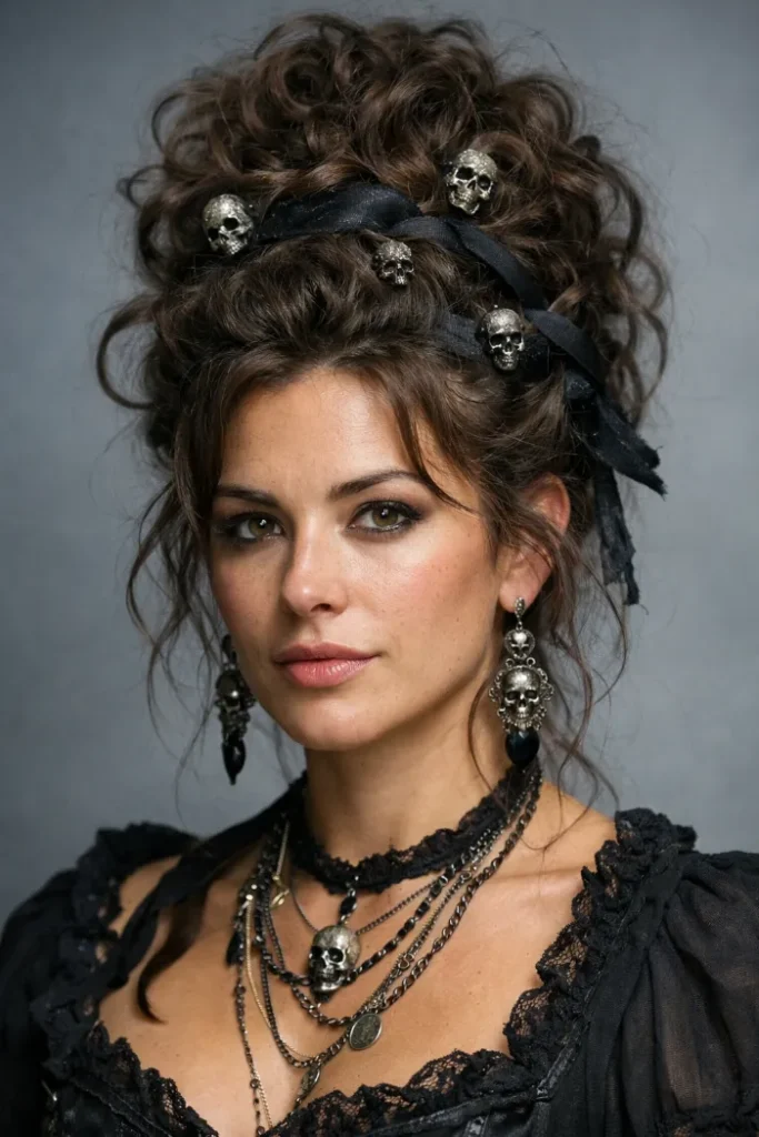 This curly updo is big, textured, and a little dangerous in the best way. The black ribbon weaves through the bun and the skull pins add bite without taking over. Leave a few wisps at the temples so it feels worn in.