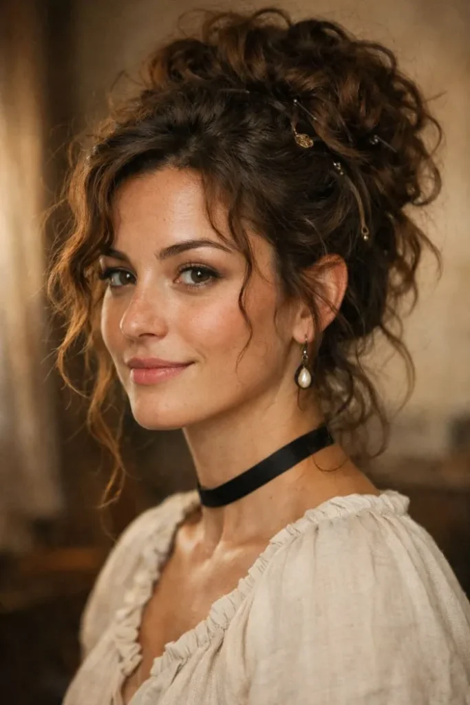 This tavern-style updo looks like you threw it up fast, but it still has shape. The curls are gathered high with loose pieces around the face, so it reads playful and flirtatious. It works even better with soft, warm makeup.