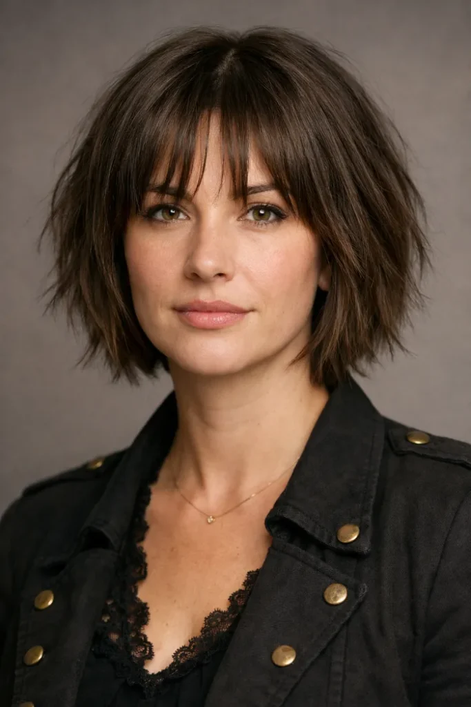 This shaggy stacked bob is all about texture and movement. The length hits around the jaw, with choppy layers and a soft fringe that breaks up the forehead. It gives pirate attitude without needing any accessories or complicated styling.