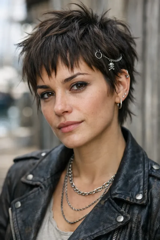 A short messy pixie can still feel pirate if you lean into rough texture. The top is spiky and broken up, with a little side sweep and a small metal charm detail near the temple. It feels cool, not costume.