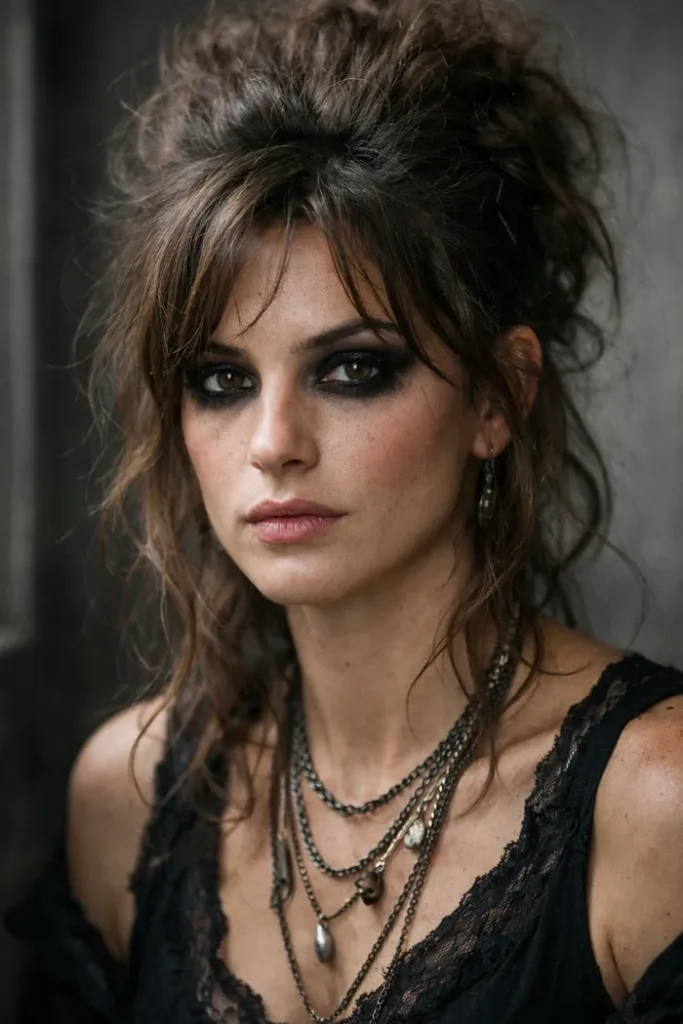 This teased messy updo is smoky, dramatic, and a little undone. The volume sits high with loose curls falling around the face, so it looks soft instead of stiff. A few stray pieces at the nape make it feel real.