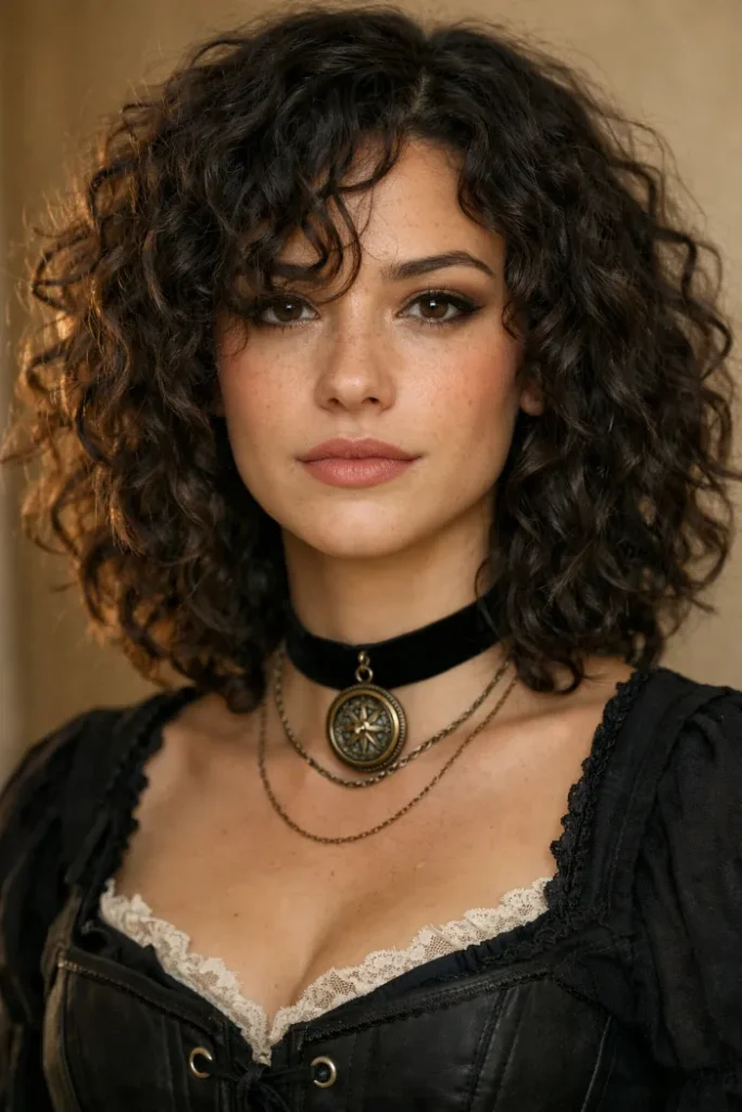 Big natural curls bring pirate drama without any extra work. The volume sits high and wide, with soft definition and a little frizz that makes it feel real. Keep the front slightly off-center so it looks lived in, not perfect.