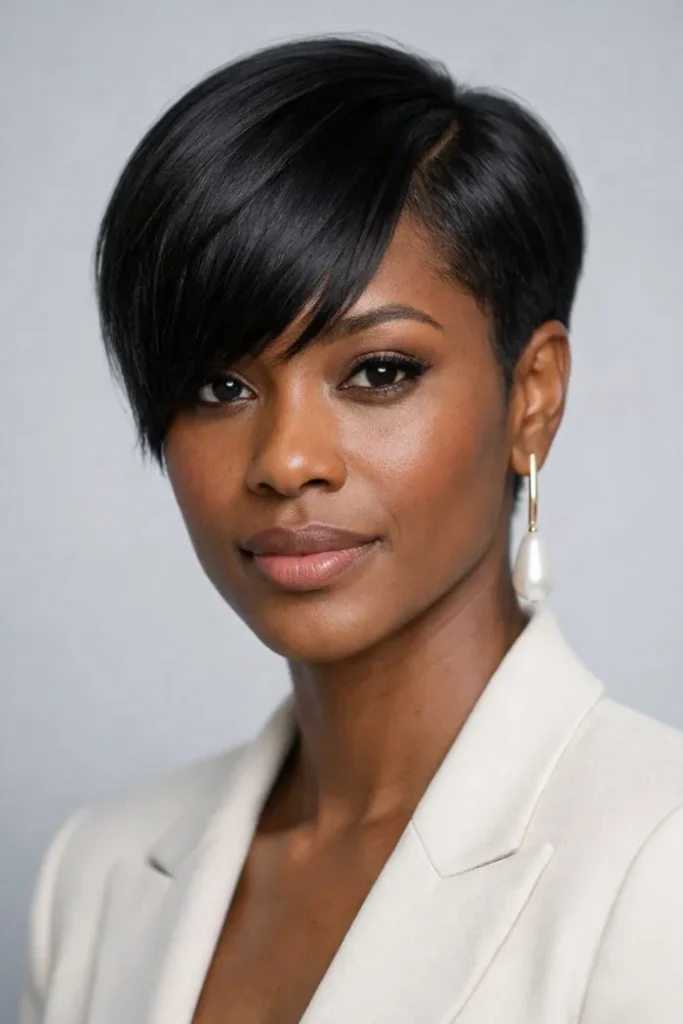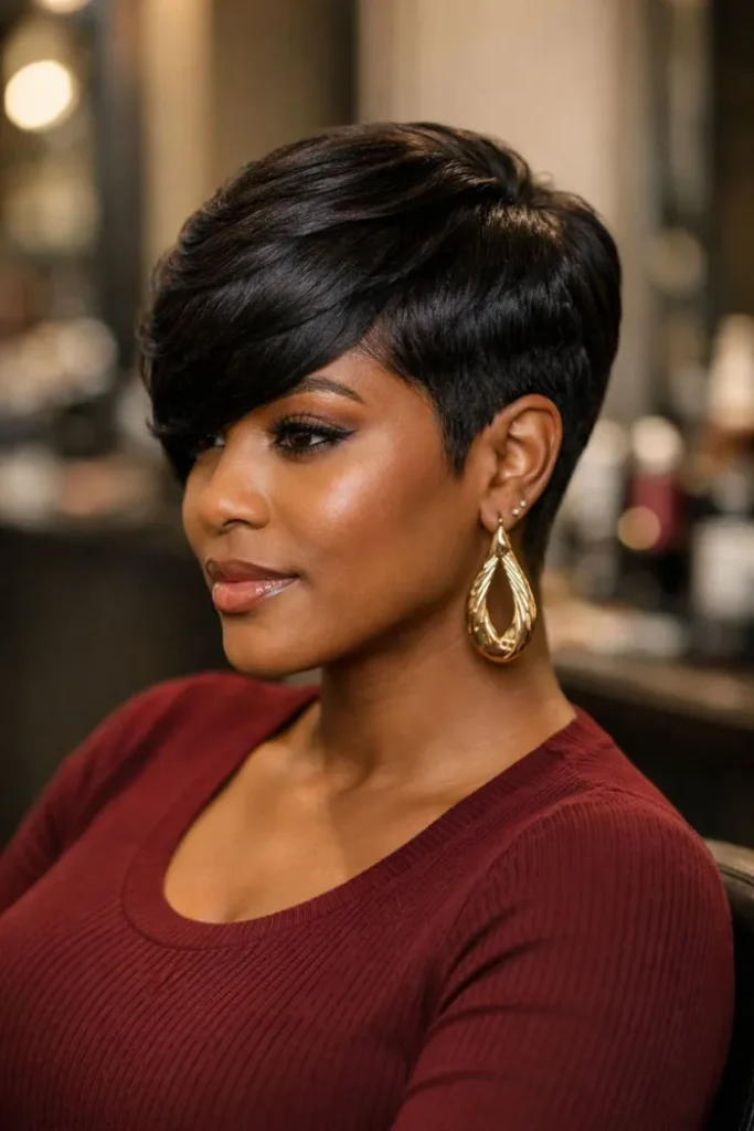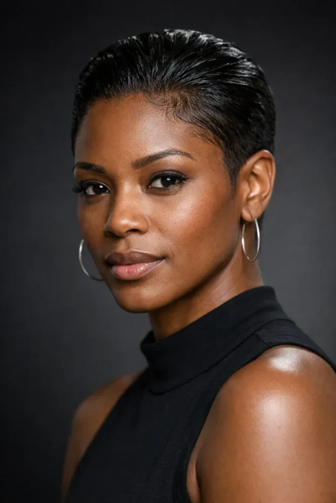 A neat side part and smooth top make this pixie feel timeless, especially with a little shine. It is the kind of cut that looks put together even on low-effort days. Use a light mousse and a wrap at night to keep it sleek.