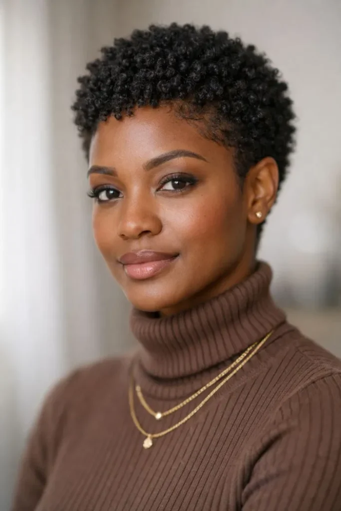 An ultra-short TWA-inspired pixie is the definition of low maintenance, but it still looks intentional. Keep the shape rounded with a gentle taper at the sides. Moisturize regularly and use a soft brush if you like a smoother finish.