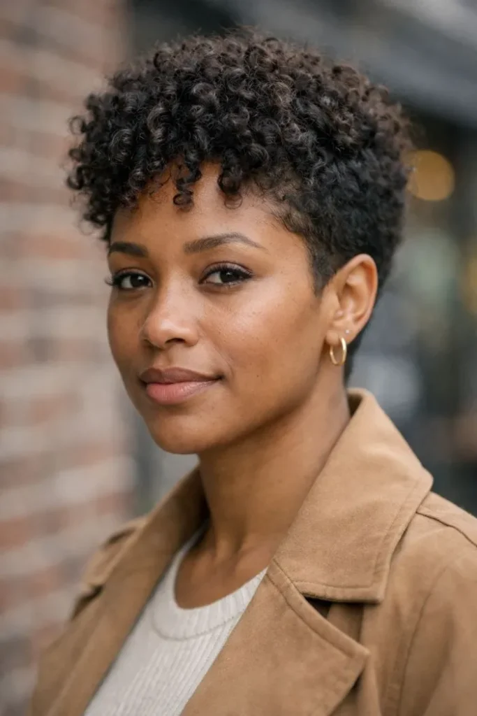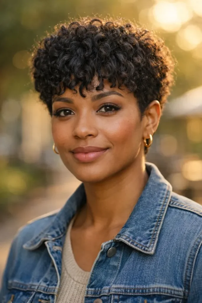 Short coils with a soft rounded outline look fresh and easy, and they show off your features in the best way. Keep the hairline natural, not over-sculpted. A leave-in plus a pea-size curl cream is enough, then let it air dry.