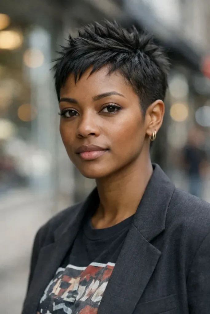 If you like a little attitude, this spiky pixie delivers without looking harsh. The top is choppy and lifted, while the sides stay tight for contrast. Use a matte clay, not gel, and style with your fingers for a lived-in finish.