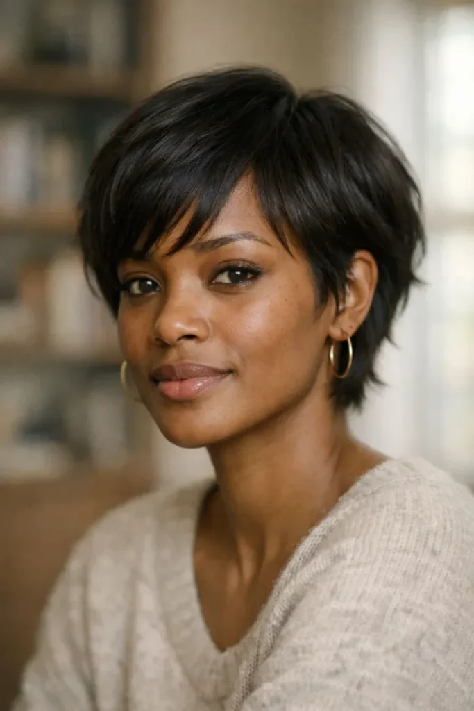 Feathered layers and a slightly messy finish make this pixie feel light and flattering. It is great when you want movement instead of a stiff set style. Work in a tiny bit of texture paste, then pinch the ends so they separate.