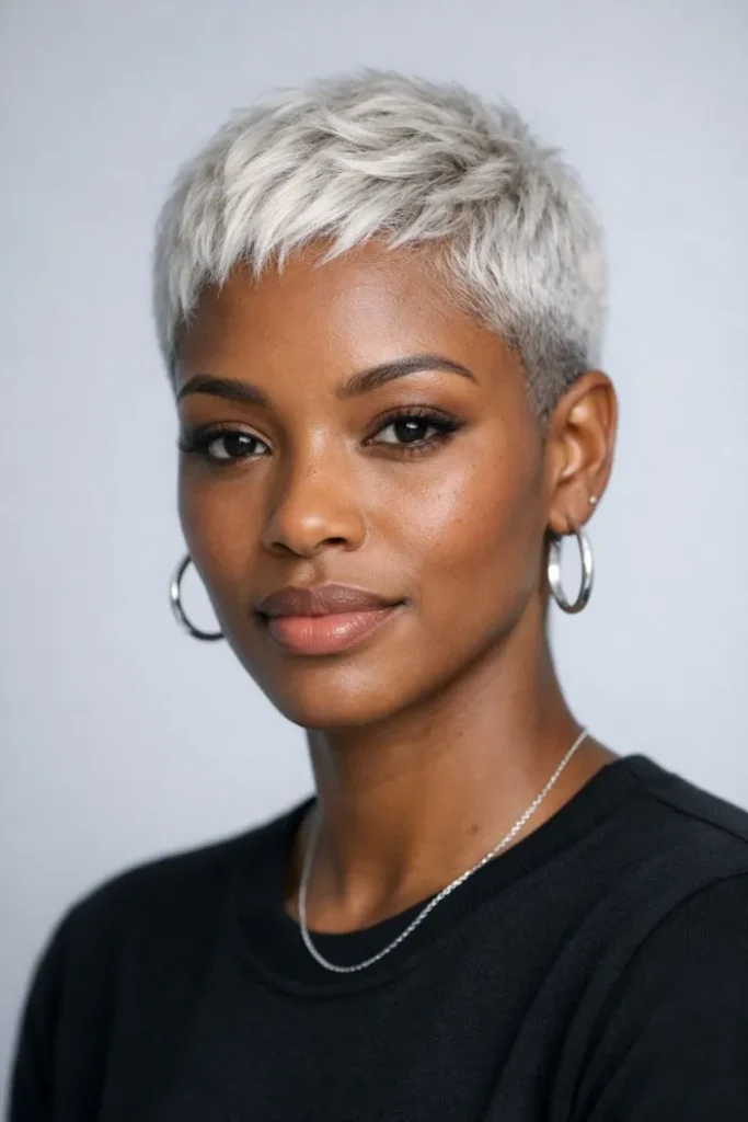 Platinum instantly turns a simple pixie into a statement, but the cut stays soft and wearable. Keep the top lightly textured, not spiky, so it flatters in daylight. Use purple shampoo once a week and a leave-in to protect the tone.