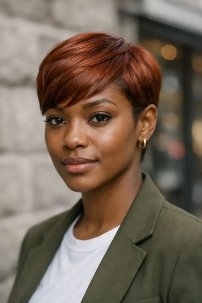 This rich copper shade warms the skin and makes a side-swept pixie look extra expensive. Ask for a deep side part and a clean taper around the ears. Keep shine controlled with a lightweight serum, not heavy oil.