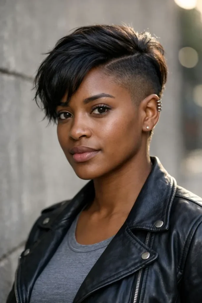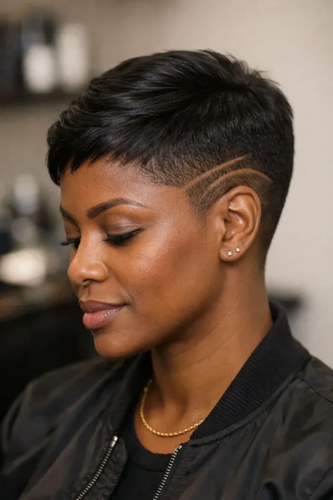 This undercut pixie gives you instant contrast: sleek length on top, clean buzzed sides underneath. It is bold, but the longer fringe keeps it feminine and flexible. Style with a blow-dry and light pomade, then tuck behind one ear.