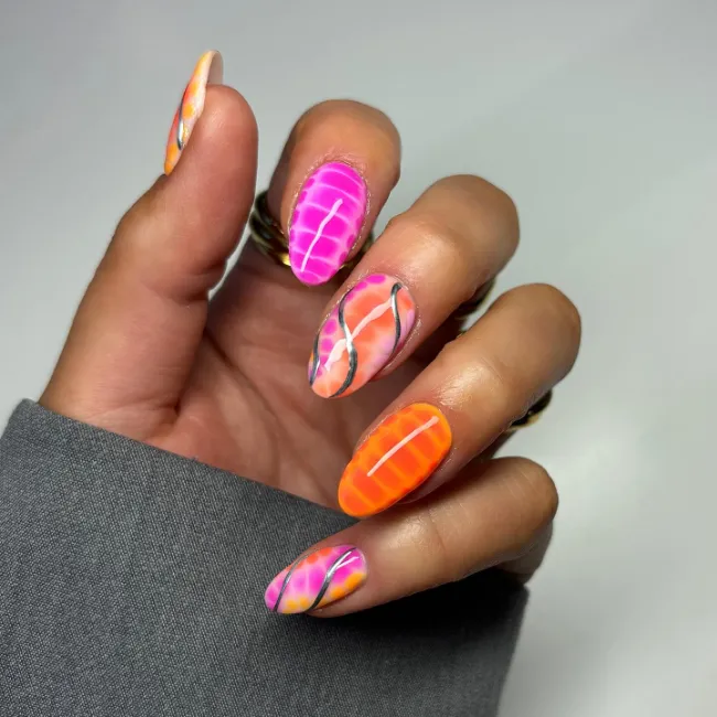 7. Neon swirl and plaid nails (Hot Pink And Orange)
