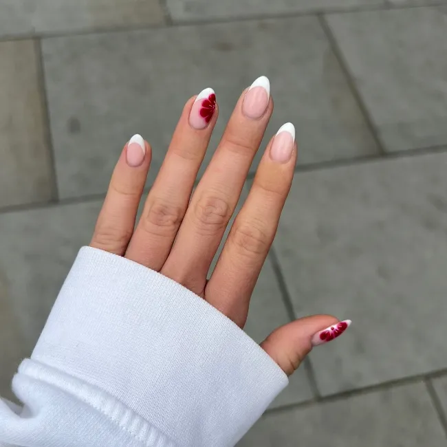 These red and white floral French tips bring a romantic vibe to fall. The vibrant red pops against the soft white for a look that’s delicate but unforgettable.
